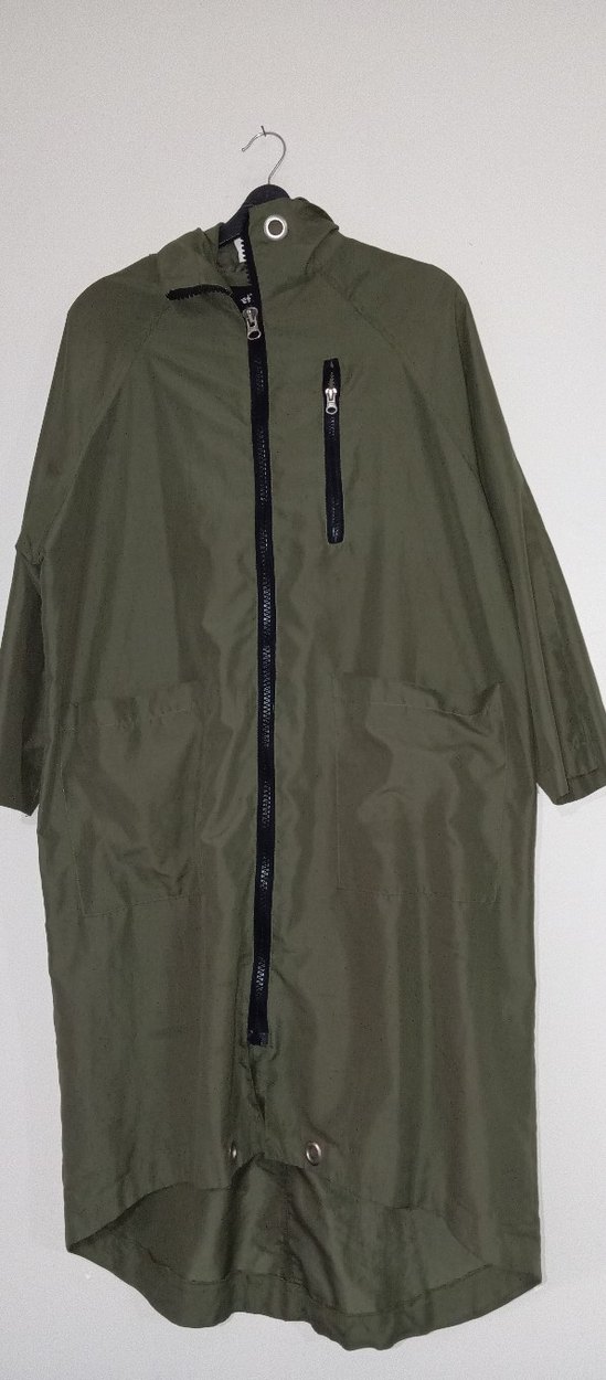 Yüksek yakalı, uzun kollu, bol kesim kadın yağmurluğu. Sentetik kumaştan üretilmiş, fermuarlı ön ve göğüs cebi bulunur. Haki rengiyle günlük sokak ve spor tarzına uygundur. ️