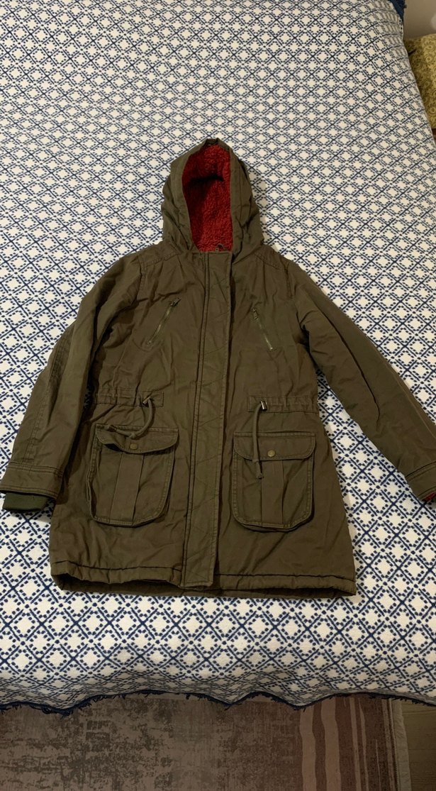 , bol kesim kadın ceketi, çıtçıtlı yakalı ve uzun kolludur. Fermuarlı önü, çoklu cepleri ve kapüşon içi yumuşak kumaşlıdır. Rahat sokak tarzı için uygundur.