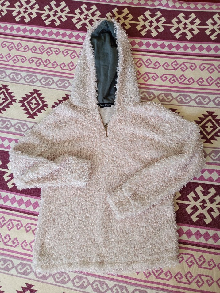 Kapüşonlu, bol kesim, yumuşak tüylü detaylı bej kadın kazak, rahat ve günlük sokak stili için uygundur.