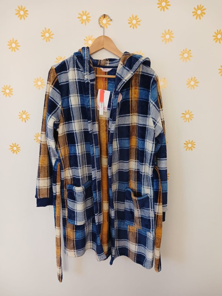 Kapüşonlu, cepli ve kemerli çok renkli ekose desenli Polar Kadın sabahlık, Yumuşak dokusuyla rahatlık sağlar.