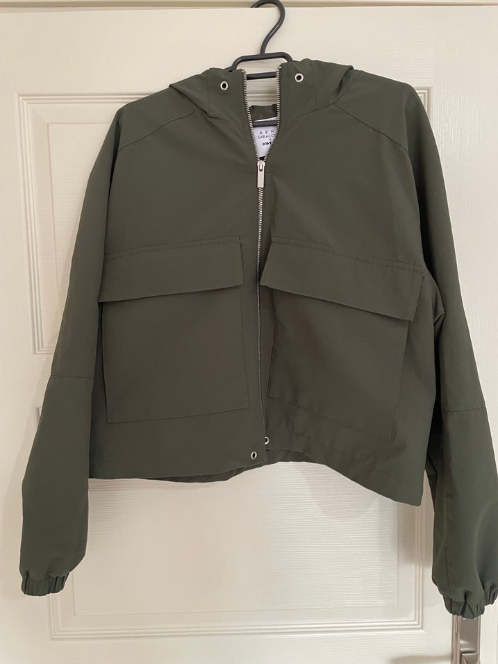 Kadınlar için kapüşonlu, bol kesim, ön fermuarlı ve uzun kollu ceket. Notlu yaka ve iki büyük cep bulunur. Haki renkte sentetik kumaştan yapılmıştır.