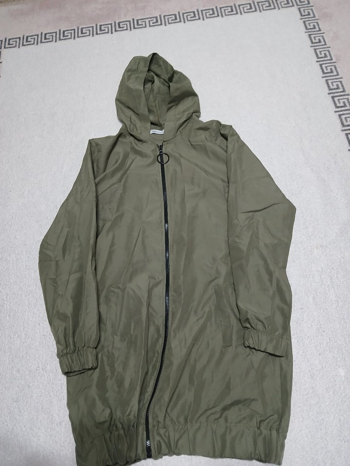 Kapüşonlu, fermuarlı, sentetik kumaştan yapılmış uzun, bol kesim haki renklidir. Uzun kollu ve gündelik kullanıma uygun. Astarsızdır. 1 kolunun alt kısmında hafif pamuklanma vardır son görsele ekledim bakabilirsiniz.