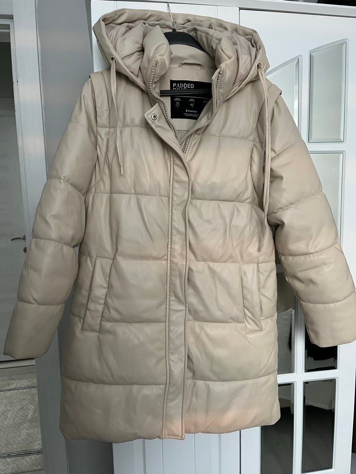 kolları çıkıyor yelek oluyor Bej renkli, uzun kollu ve düğmeli kadın kışlık mont. Yumuşak sentetik kumaştan, kapüşonlu ve notched yakalı, midi boyda, günlük sokak tarzı için uygun.