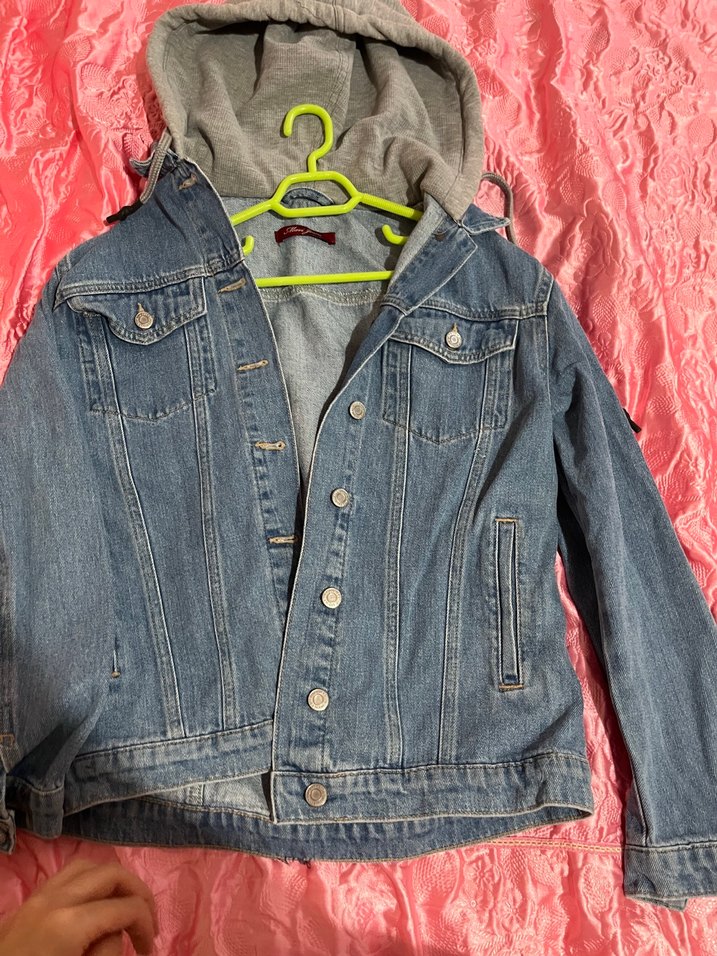 Kadın kot ceket, kapüşonlu ve düğmeli, fitted kesim, notched yaka, uzun kollu, gri renkte, günlük rahat kullanım için uygun.