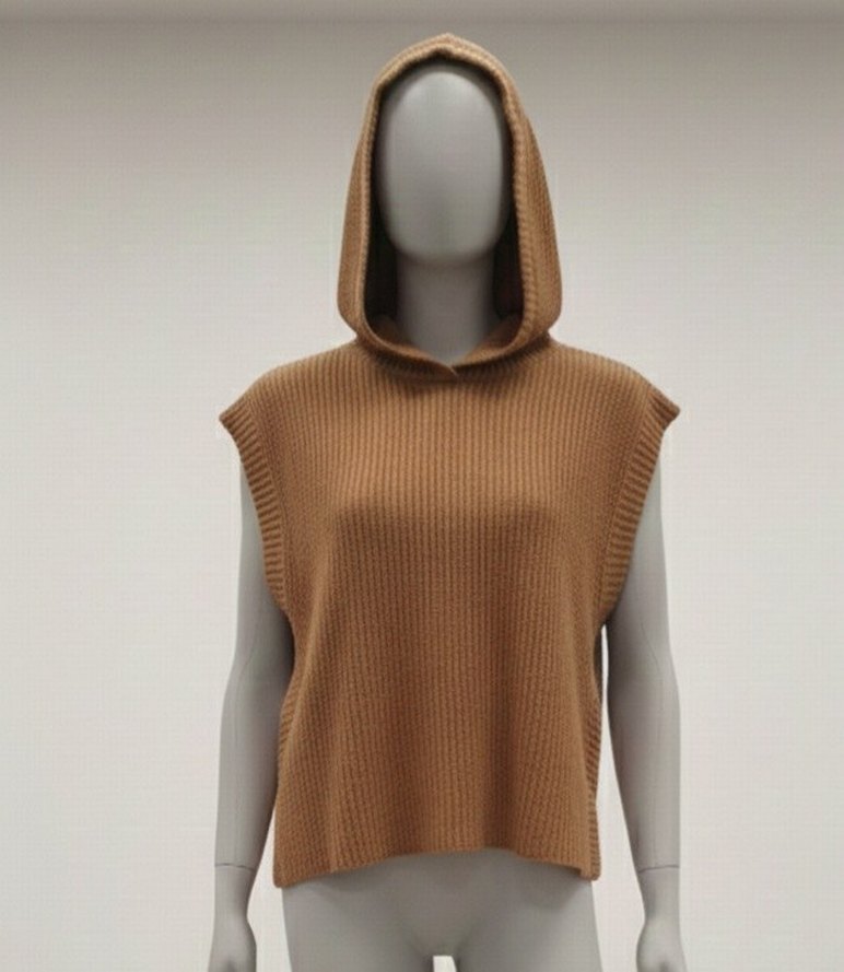 Kapüşonlu, kahverengi örgü kadın süveter. Kolsuz, yuvarlak yaka ve bol kesim, midi boyda rahat bir modeldir.