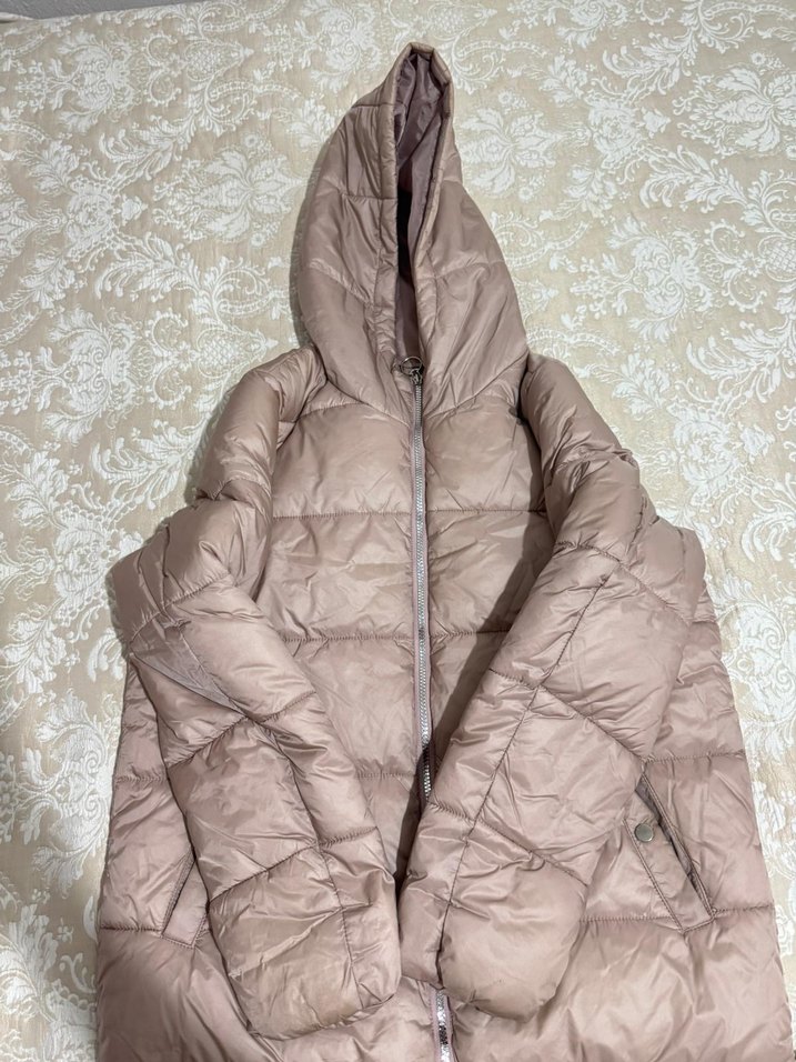 Kadınlar için kapüşonlu, uzun ve fitted kesim pudra kışlık mont. Yumuşak sentetik kumaştan, fermuarlı ve notched lapel yakalı, günlük kullanıma uygun rahat bir stil sunar.