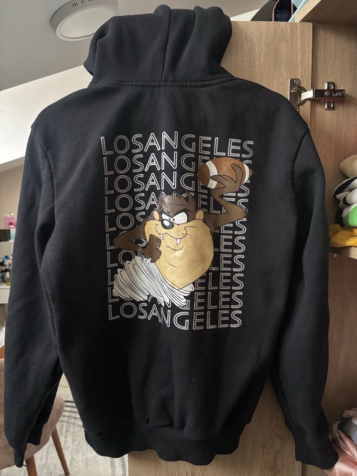 Koyu kahverengi kapüşonlu kadın sweatshirtü, uzun kollu ve fermuarlı. Gevşek kesimi ve baskılı çizgi film karakteri ile 'LOS ANGELES' yazısı bulunur. Yumuşak ve sıcak kumaştan üretilmiştir.