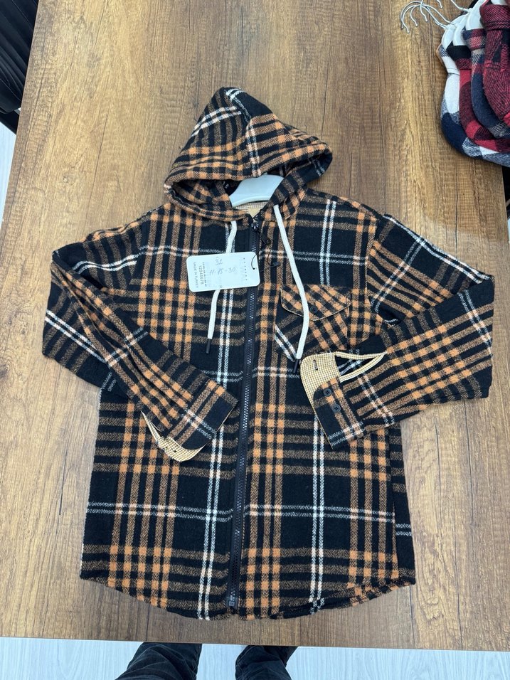 Kapüşonlu, düğmeli kahverengi ekose uzun kollu gömlek, yumuşak ve sıcak kumaştan, rahat bir kesime sahiptir.