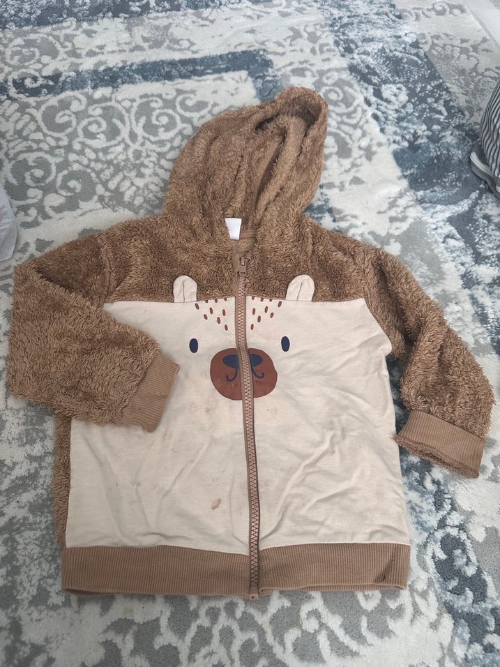 Kapüşonlu, bol kesim erkek çocuk ceketi, kahverengi ve gri renklerde yumuşak kürk detaylı kumaş ve önünde sevimli ayı baskısı bulunur. Peluş yumuşacık sadece yıkanması gerek