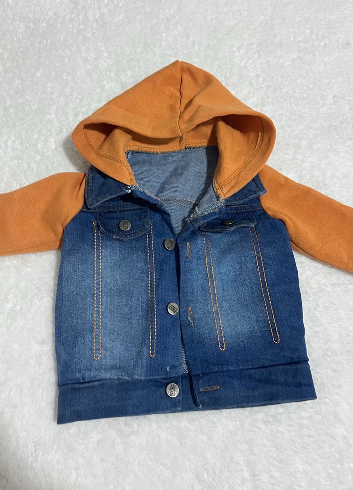 Bu erkek çocuk kot ceket, kahverengi kapüşonlu kollar ve düğmeli ön kısmıyla rahat sokak stili için uygun, dar kesimdir.