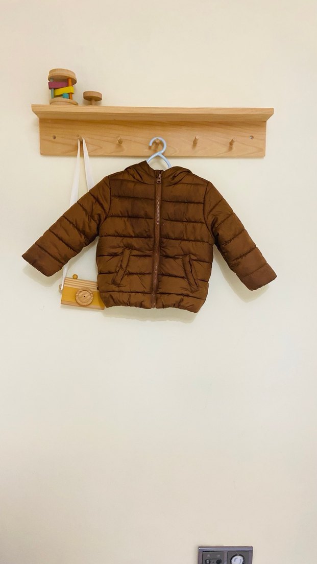 Kapüşonlu ve fermuarlı kahverengi, yumuşak ve sıcak kumaştan yapılmış, erkek çocuk montu.