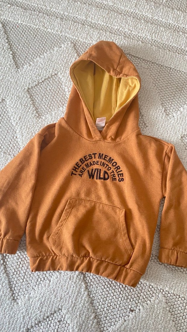 Kapüşonlu, uzun kollu ve bol kesim erkek çocuk sweatshirtü. Yumuşak fleece kumaştan, örme dokulu ve 'The best memories are made into the wild' baskılı. Kahverengi, retro sokak stili.
