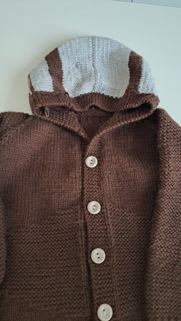 Kahverengi ve gri kapüşonlu, uzun kollu, triko örgüden yapılmış erkek çocuk hırkası. Düz renk, normcore tarzda, vücuda oturan kesime sahip.