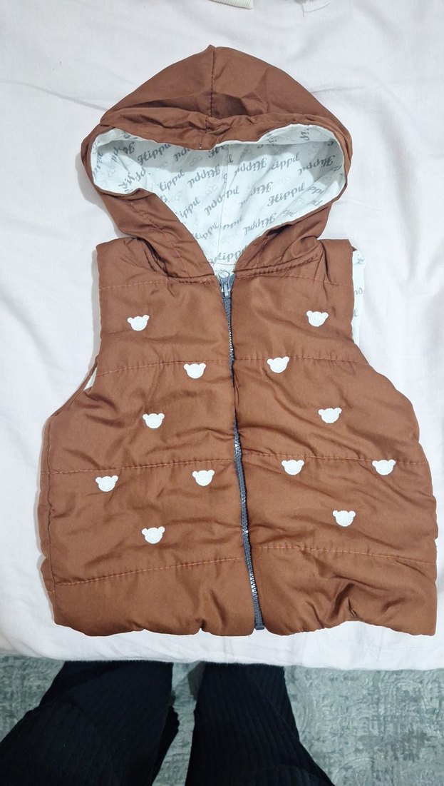 Kapüşonlu, düğmeli ve ince kahverengi erkek çocuk yeleği. Ayarlanabilir, yumuşak ve sıcak kumaştan, ayı figürlü detaylarla süslenmiştir.