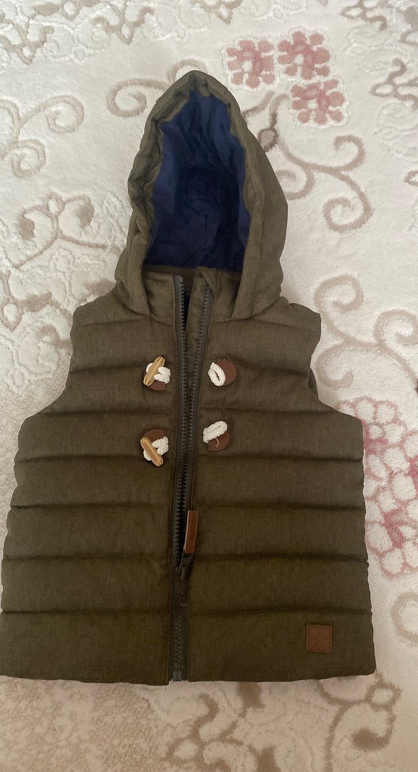Kapüşonlu, düğmeli kahverengi erkek çocuk yeleği, yumuşak dolgulu kumaştan, dar kesim ve yaka detaylıdır.