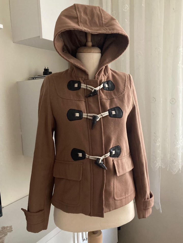 Kapüşonlu, düğmeli kahverengi kaban, ön cepler ve uzun kollu tasarım içerir.