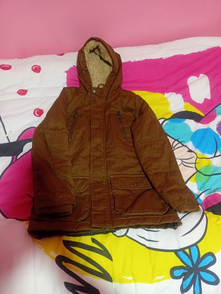 Kapüşonlu, kahverengi, yumuşak ve sıcak kumaştan erkek cocuk mont. Bol kesim, fermuarlı cepler ve midi boyda, günlük rahatlık için ideal.