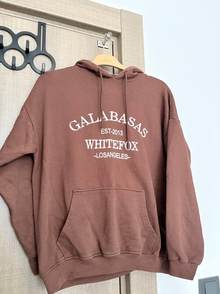 Bol kesim, koyu kahverengi kapüşonlu sweatshirt, uzun kollu ve ön cep detaylıdır. "GALABASAS WHITEFOX LOSANGELES" baskısı bulunur, rahat ve sıcak kumaştandır.
