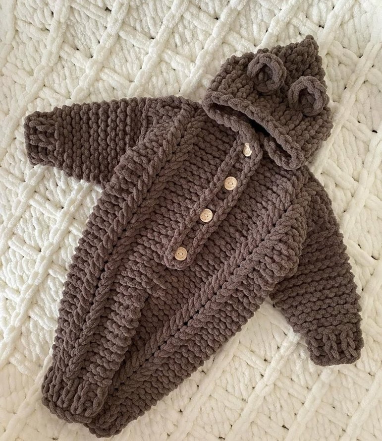 Kapüşonlu ve kulak detaylı kahverengi örgü bebek tulumu, düğmeli ve uzun kollu, günlük kullanıma uygun rahat ve şık bir tasarımdır.