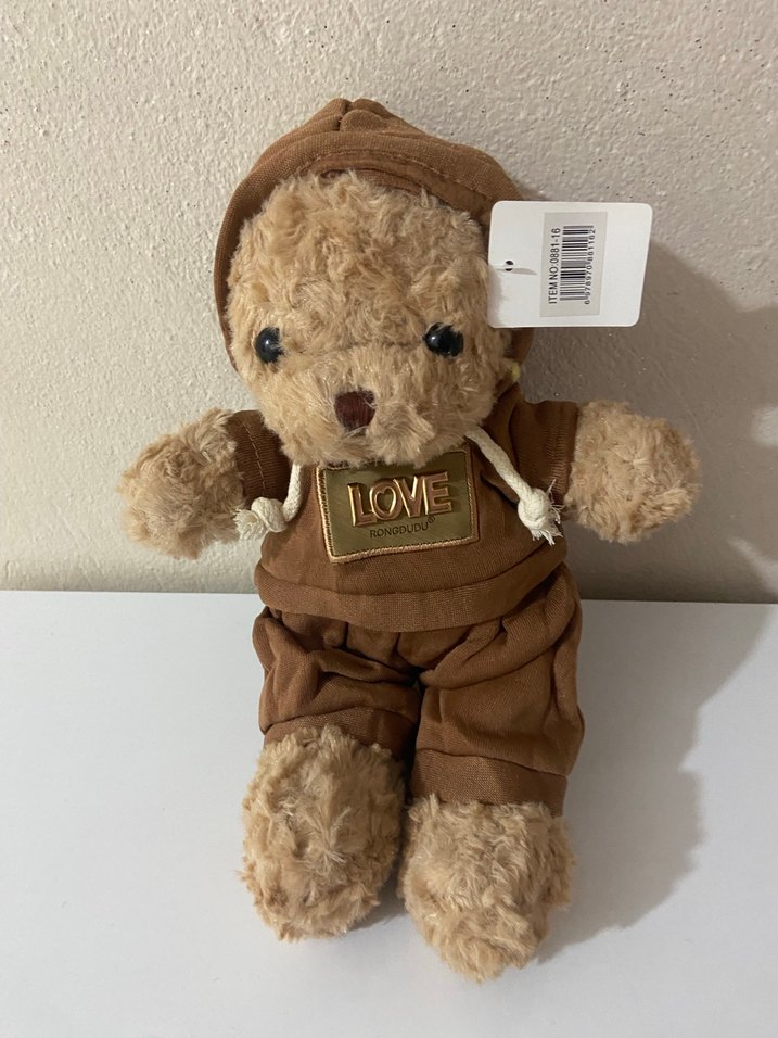 Yumuşak kapüşonlu üst ve pantolon giymiş kahverengi peluş ayıcık. Göğsünde 'LOVE' yazan bir detay bulunur. Pastel tonlarda, yumuşak dokulu.