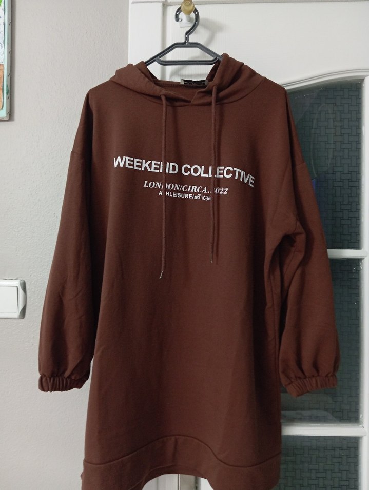Kapüşonlu, kahverengi sweatshirt, uzun kollu ve bol kesimdir. Yumuşak sentetik kumaştan yapılmış, üzerinde 'WEEKEID COLLECTIVE, LONDONCIRCA.022' baskısı ve örme detaylar bulunur.