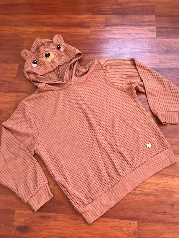 Kapüşonlu, uzun kollu, kahverengi örgü kadın sweatshirt, sevimli hayvan yüzü detaylı. Yumuşak ve sıcak kumaştan, rahat kullanım için uygun.