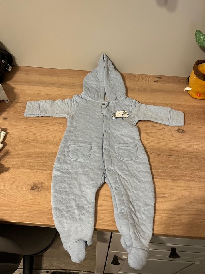 Bebe mavisi, kapüşonlu ve kapitone desenli yumuşak ve sıcak tutan bebek tulumu. Kullanıma bağlı tüylenme oluşmuştur yurtdışından gelmiştir