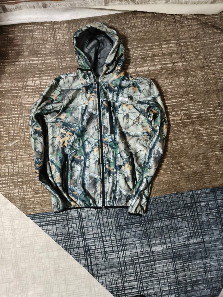 Gri kamuflaj desenli, kapüşonlu ve fermuarlı, sentetik kumaştan yapılmış erkek avcı kampci polar