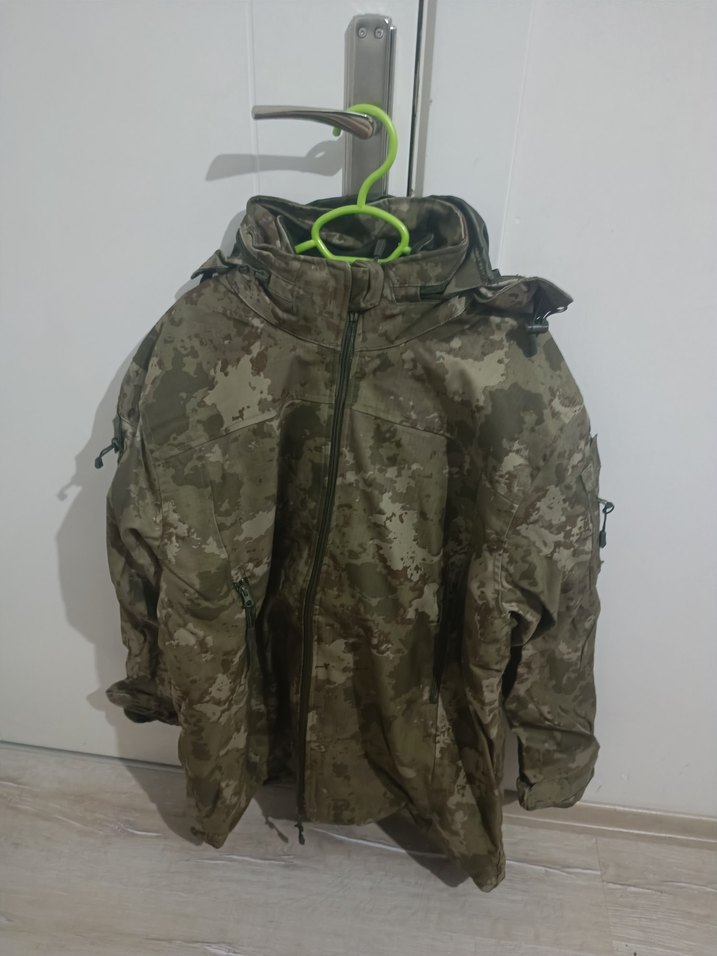 Gri ve kahverengi kamuflaj desenli, kapüşonlu ve fermuarlı, sentetik kumaştan erkek ceket. Sokak stili ve outdoor kullanıma uygun, bol kesim.