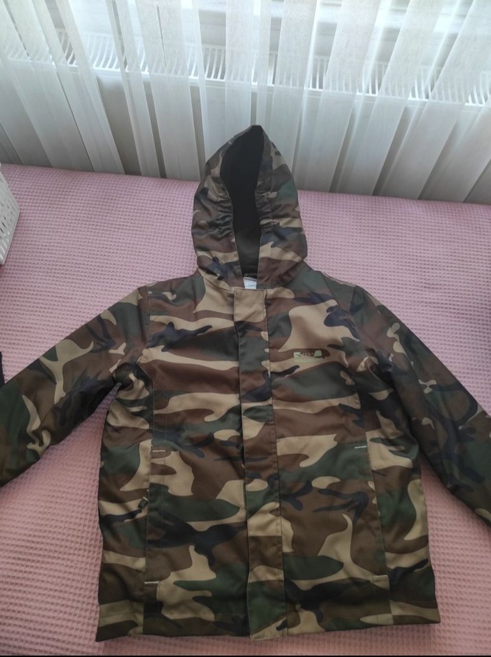 Erkek çocuk montu, kapüşonlu ve düğmeli ön kısımlı, bol kesimdir. Sentetik kumaştan yapılmış koyu kahverengi kamuflaj desenine sahiptir.
