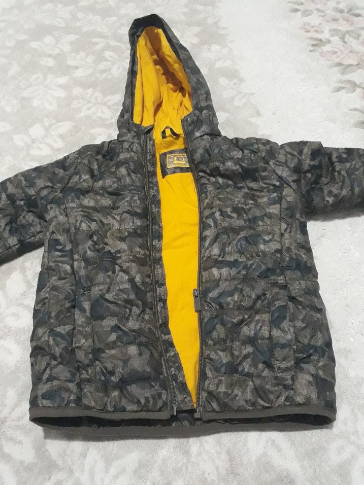 Gri kamuflaj desenli, kapüşonlu ve fermuarlı erkek çocuk montu. İç kısmı sarı renkli, rahat ve şık sokak tarzı ceket.
