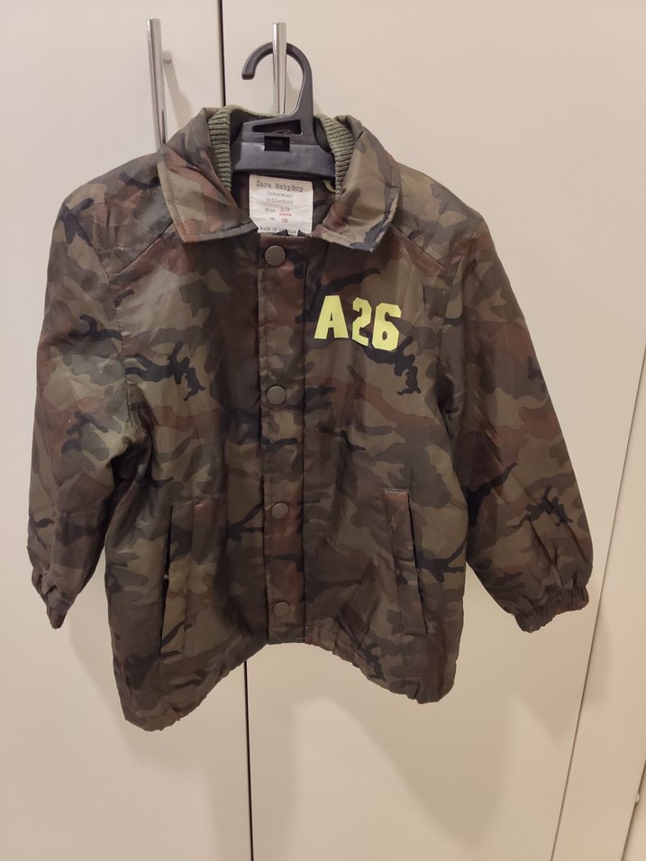 Kapüşonlu, düğmeli ve kahverengi kamuflaj desenli erkek çocuk montu, rahat kesim ve yumuşak kumaştan üretilmiştir. Göğüste "A26" baskısı bulunur.