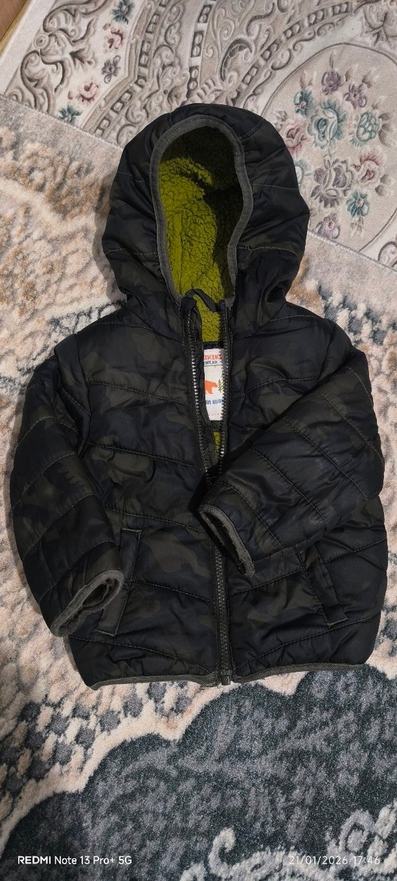 Kapüşonlu, kamuflaj desenli, içi kürklü ve yumuşak, sıcak tutan kumaştan yapılmış, dar kesim erkek çocuk montu.