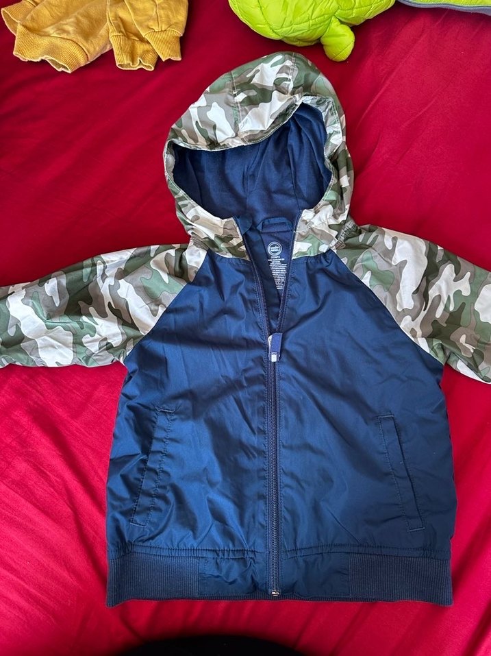 Kapüşonlu, kamuflaj desenli kollara ve koyu mavi gövdeye sahip fermuarlı, rahat kesim erkek çocuk yağmurluk