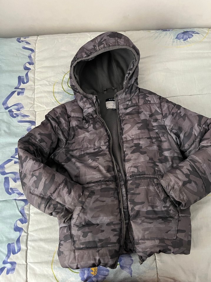 Gri kamuflaj desenli, kapüşonlu ve fermuarlı erkek çocuk montu. Yumuşak ve sıcak kumaştan, trend sokak stiline uygun şık kesim.sadece fermuarlı çıktı haricen bir sıkıntısı yoktur
