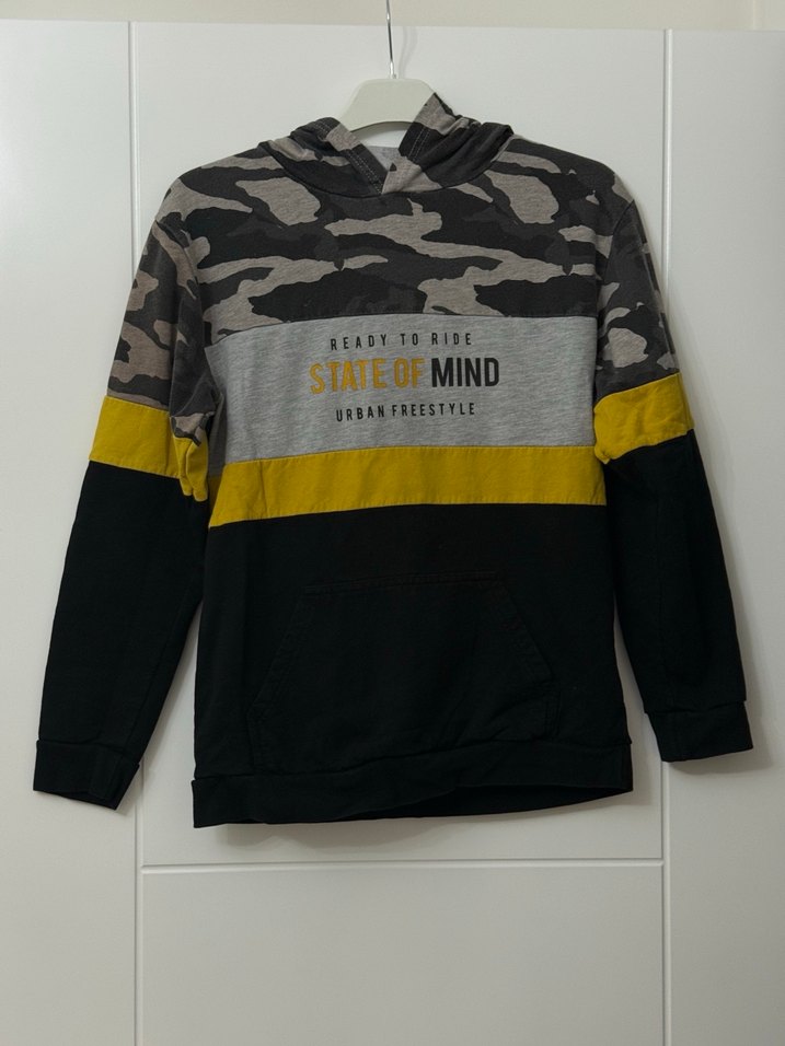 Kapüşonlu, uzun kollu ve bol kesim olan bu erkek sweatshirtü, gri kamuflaj desenli ve sarı-siyah renk bloklu. Yumuşak sentetik kumaştan örülmüştür. Önünde "STATE OF MIND" ve "READY TO RISE" yazıları bulunur. 12-13 yaşdır.