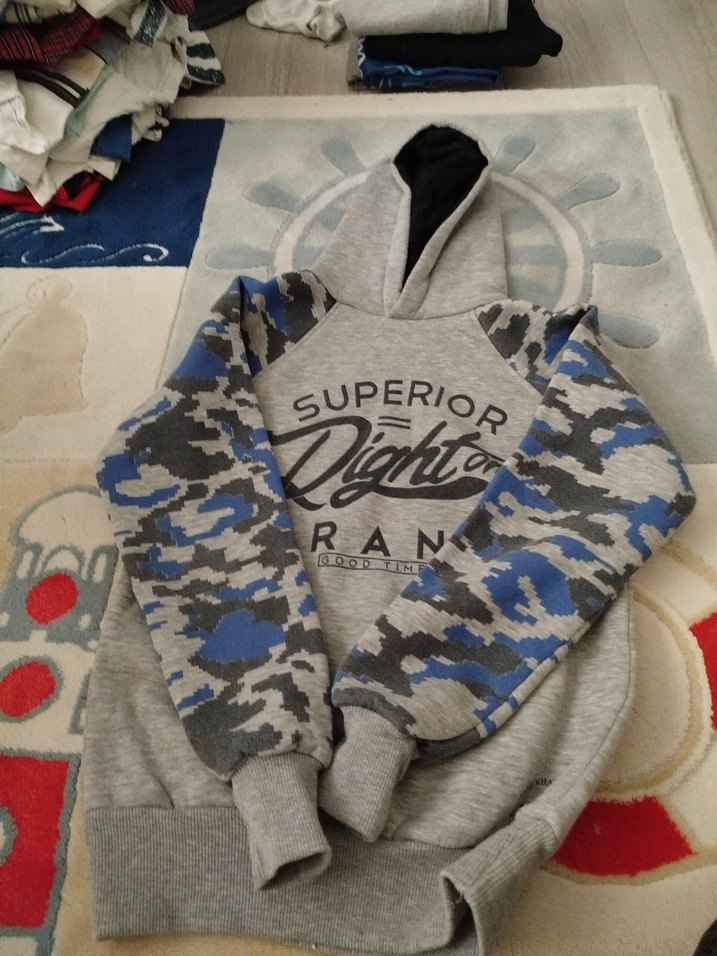 Kapüşonlu ve uzun kollu, mavi ve gri kamuflaj desenli, ince kesim erkek sweatshirt. Yumuşak polar kumaştan, örme manşetlerle, trend sokak stili için uygun.