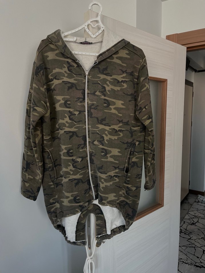 Kamuflaj desenli, kapüşonlu ve fermuarlı kadın ceket. Rahat kesim, midi boy ve yumuşak sentetik kumaştan, gri ve kahverengi tonlarında. Günlük kullanıma uygun.