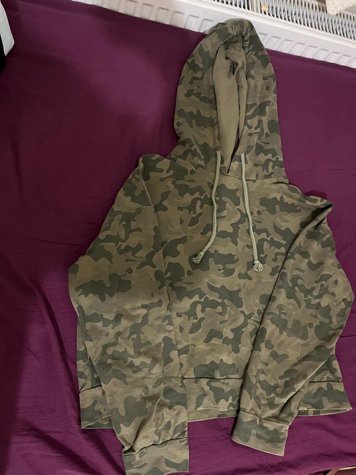 Kapüşonlu, uzun kollu ve kamuflaj desenli, sentetik kumaştan üretilmiş, rahat kesim kadın sweatshirt. Sokak stili ve dış mekan kullanımı için uygundur.