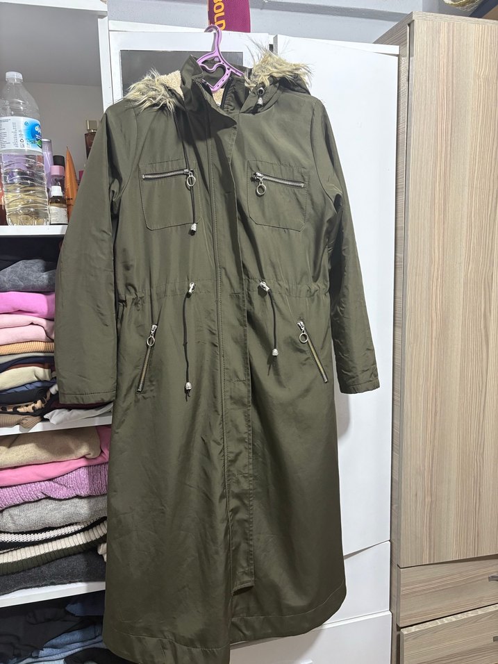 Sentetik kumaştan, kapüşonlu ve kürklü yakalı, kamuflaj desenli uzun kadın mont. Fermuarlı cepler ve bol kesim ile günlük kullanıma uygun.