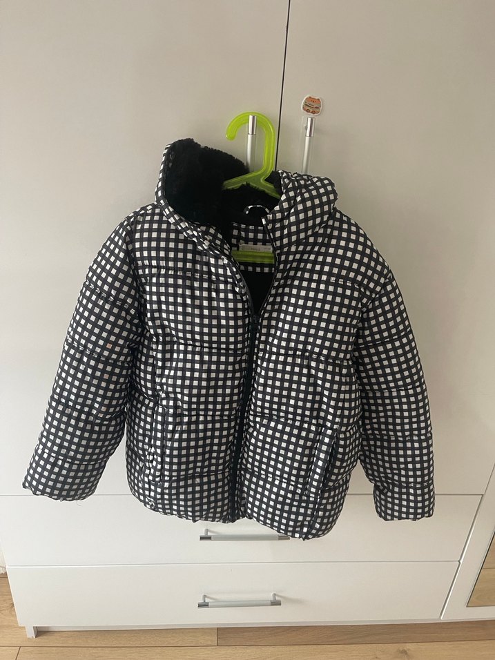 Düğmeli ve kapüşonlu, kareli desenli, yumuşak ve sıcak kumaştan üretilmiş, fitted kesim çocuk kabanı.