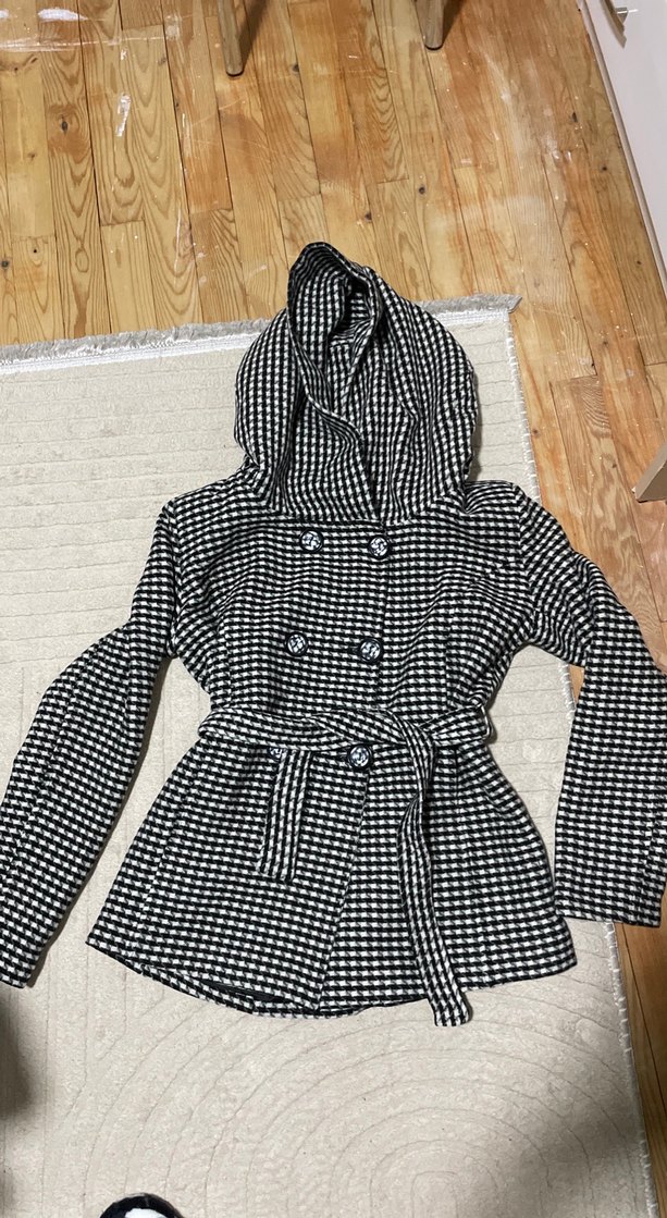 Düğmeli ve kapüşonlu, yumuşak ve sıcak kumaştan kareli desenli, uzun kollu, midi boy kadın kaban. Kemerli ve fitted kesimlidir, koyu gri renktedir.