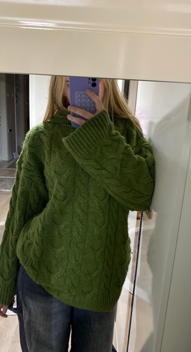 Kadınlar için yeşil renkli, örgü boğazlı ve uzun kollu kazak. Salaş kesimi ve normal boyuyla rahat ve şık bir günlük kullanım parçası. Unpatterned ve konforlu yapıda.