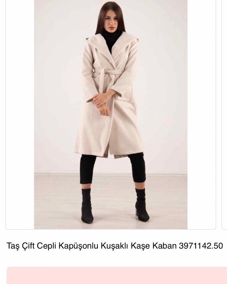 Bej renkte, kapüşonlu, kemerli ve çift cepli yumuşak ve sıcak kaşe kumaştan yapılmış kaban. Soğuk havalar için uygun.