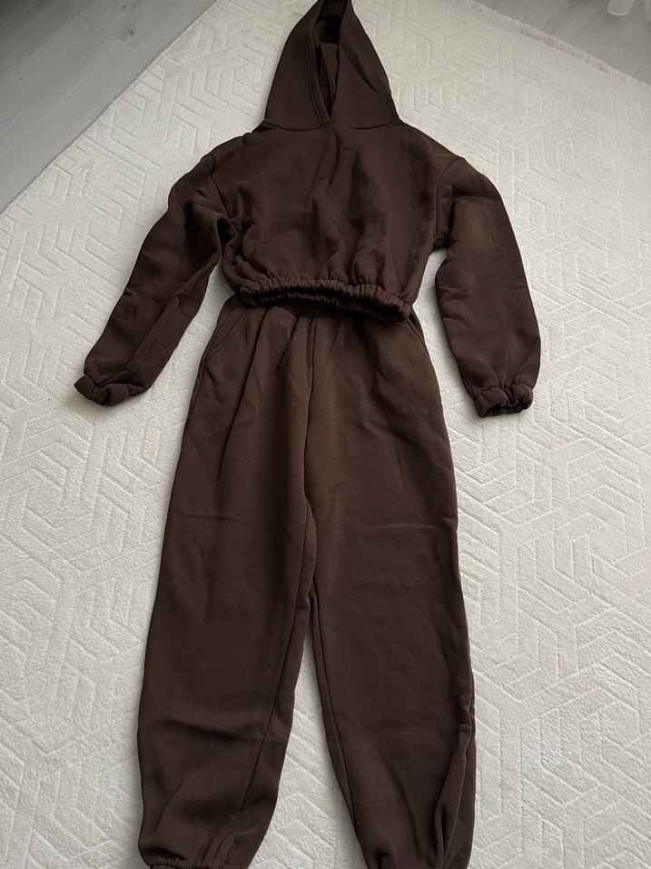 Yumuşak ve sıcak kumaştan yapılmış, kapüşonlu şardonlu 3 iplik ve kemerli kahverengi bol kesim tulum. Uzun kollu ve günlük kullanıma uygun rahat tarza sahiptir.