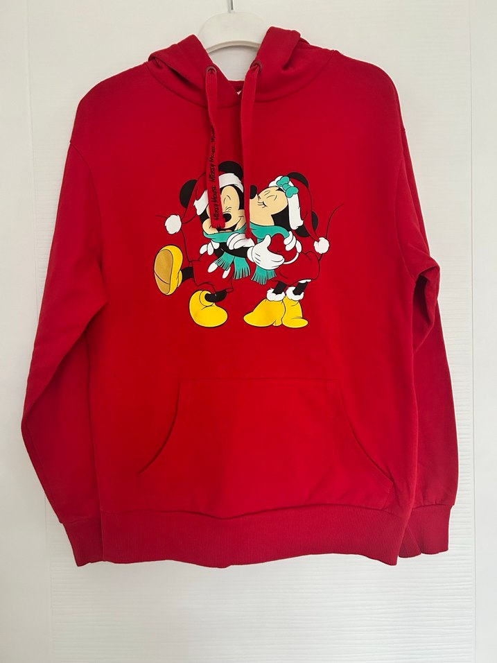 Kapüşonlu, uzun kollu kırmızı sweatshirt, renkli Mickey ve Minnie baskılı, rahat kesim ve örme dokulu, sokak stiline uygun.