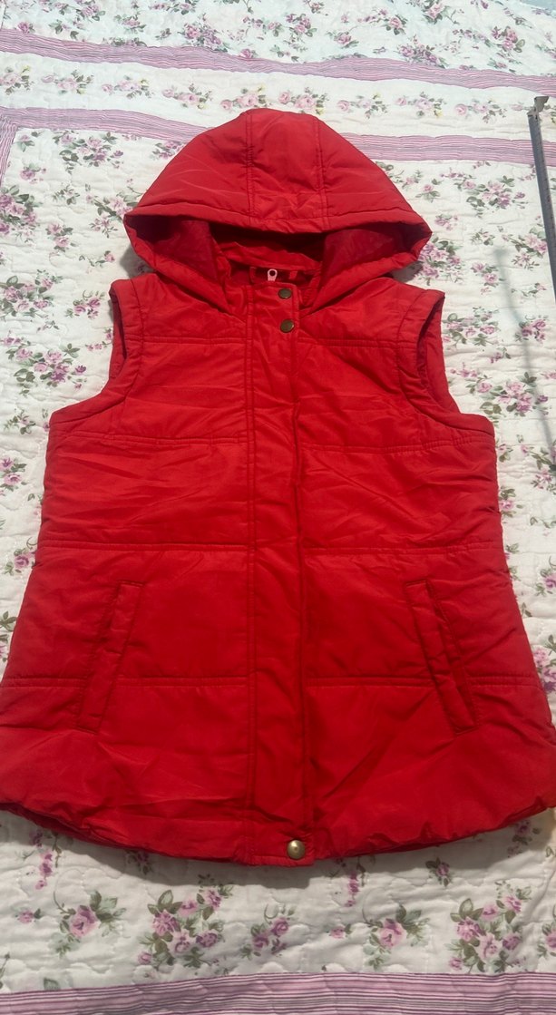 Kapüşonlu ve fermuarlı, yumuşak ve sıcak kumaştan yapılmış kırmızı, kolu olmayan, vücuda oturan yelek. Günlük kullanıma uygun rahat sokak stili.