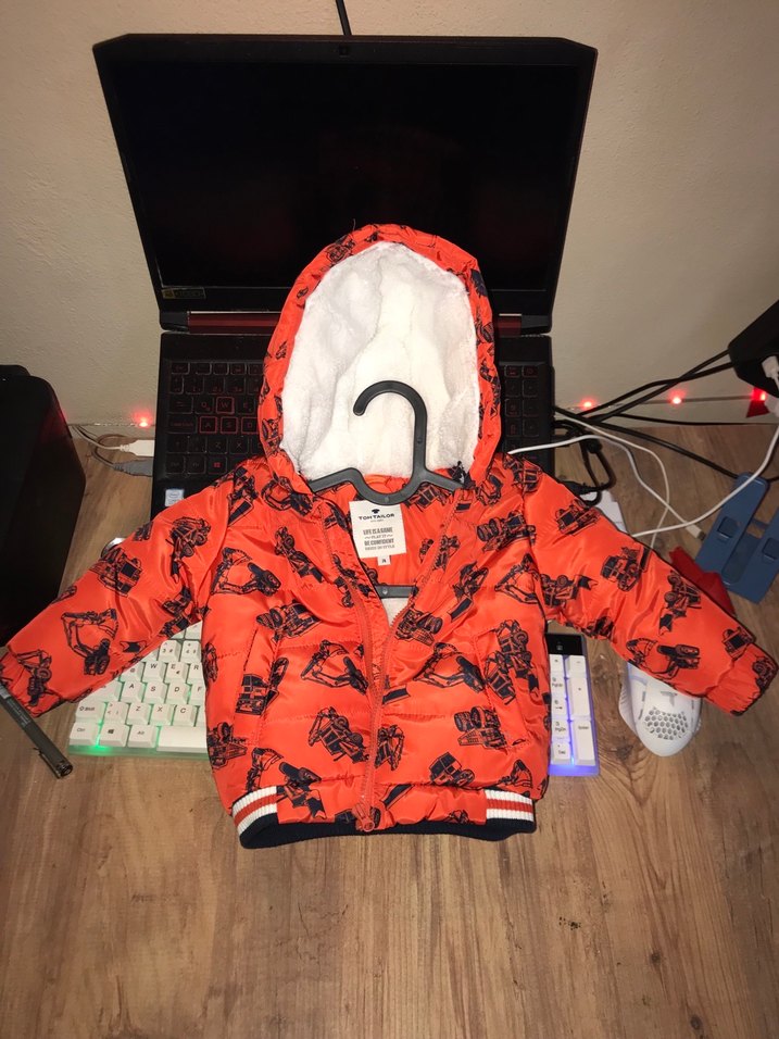 Renkli baskılı, kapüşonlu ve kürk detaylı, dar kesim kırmızı erkek çocuk montu. Sokak stiline uygun, şık ve rahat bir parça.
