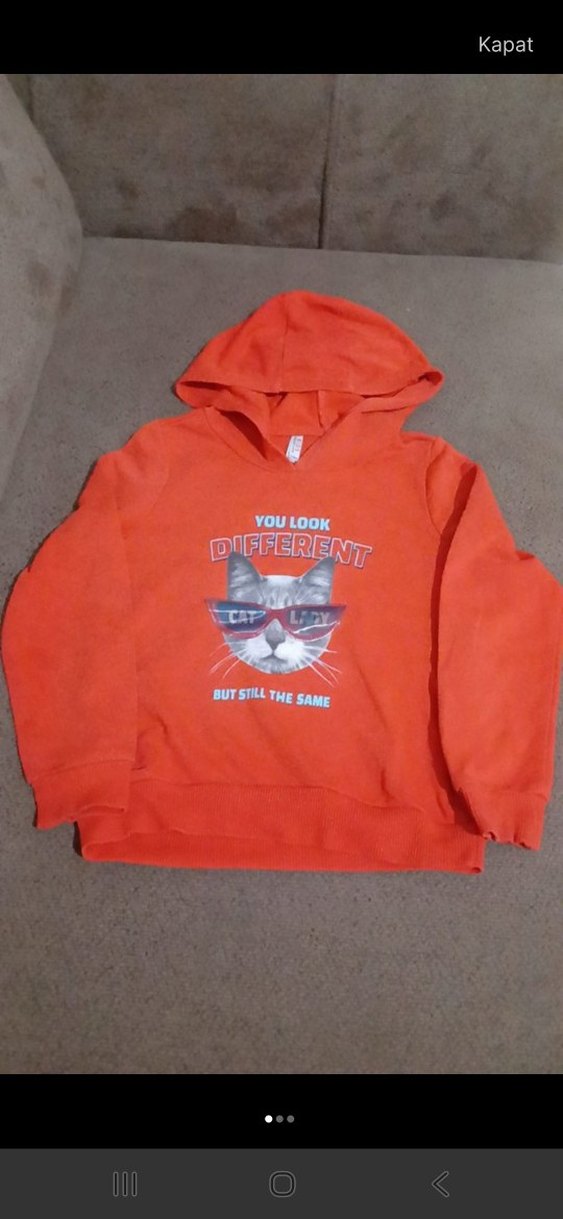 Uzun kollu, kapüşonlu kırmızı sweatshirt, renkli baskılı kedi deseni ve 'YOULOOK DIFFERENT BUT STILL THE SAME' yazılarıyla. Yumuşak ve rahat kumaştan, bol kesim.