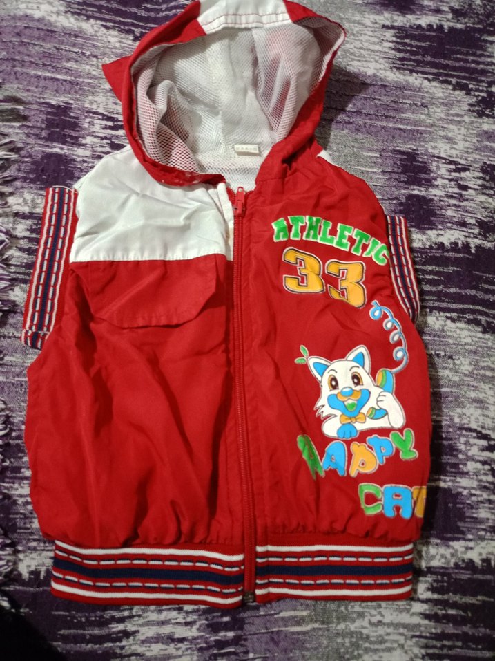 Kapüşonlu, renkli baskılı, kırmızı erkek çocuk yeleği. Fermuarlı, kolsuz ve çizgili ribana detaylı, fit kesim. Eğlenceli kedi baskısı bulunur.